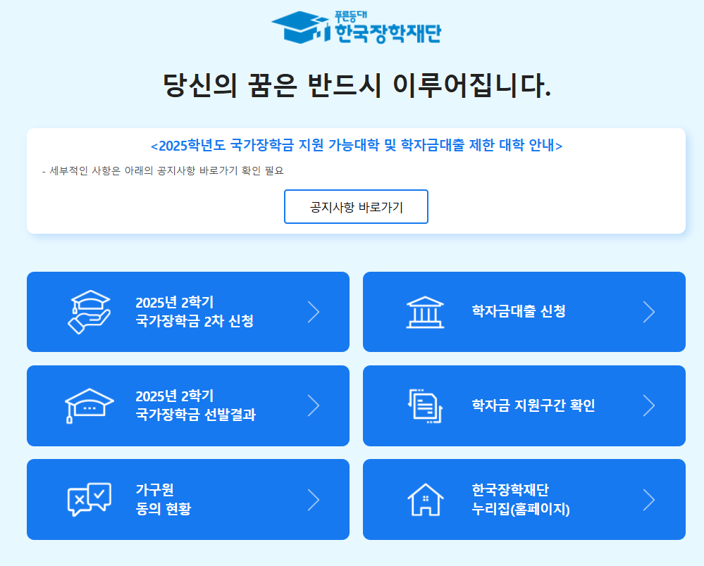2025학년도 2학기 2차 국가장학금 신청은 8월 13일부터 9월 10일 오후 6시까지 진행됩니다.